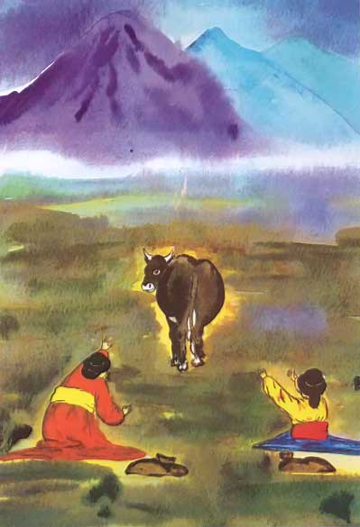 С этими словами чёрная корова дважды ударила копытом о землю. И сразу же мачеха и Ен Фа превратились в две большие болотные кочки.